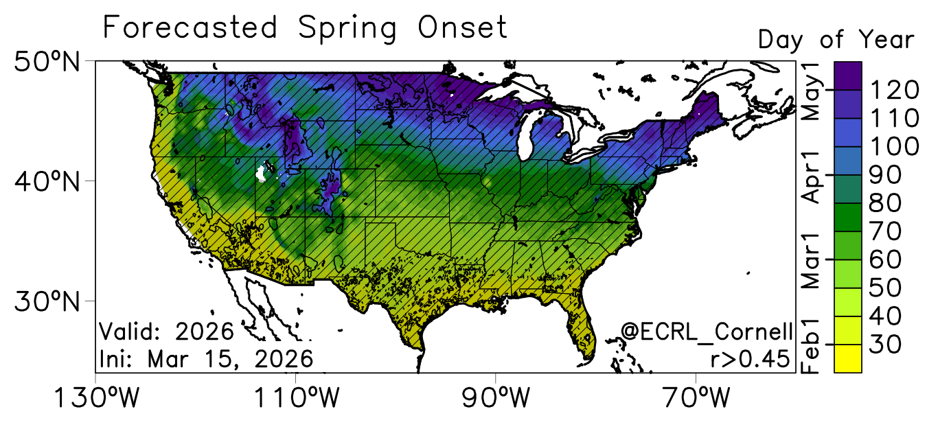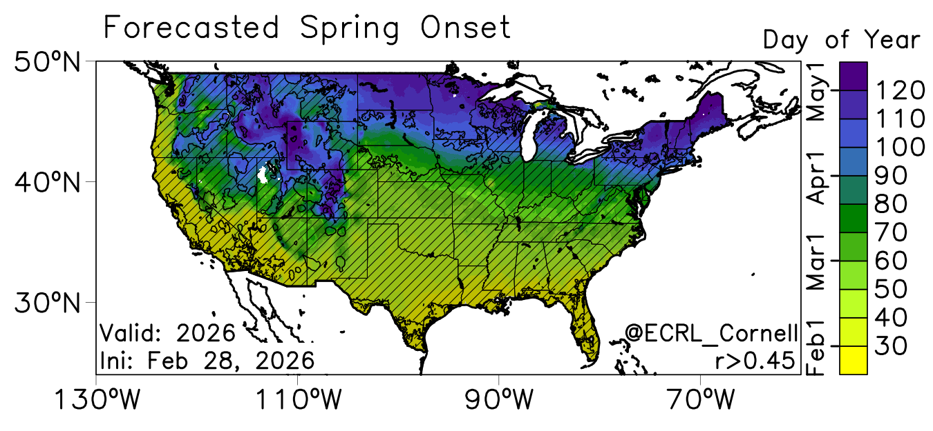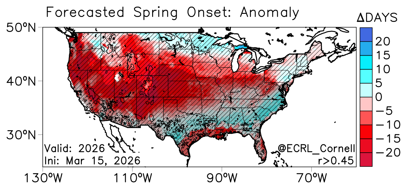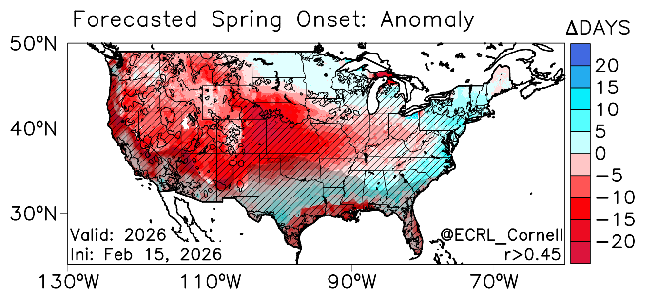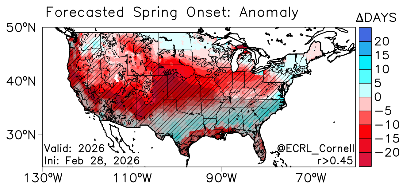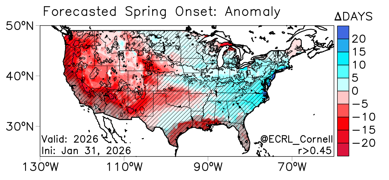 The map above shows the spring onset forecasting (ΔSI-x; spring index anomaly) in units of days. Negative values mean early onset from a climatology defined for 1982-2010 and positive values for late-onset. The black solid lines indicate the forecasting skill (local skill), e.g., validated regions where the spring onset has correlation thresholds of r > 0.45. Also, the gray shaded zones are regions where the spring onset (SI-x) has occurred.