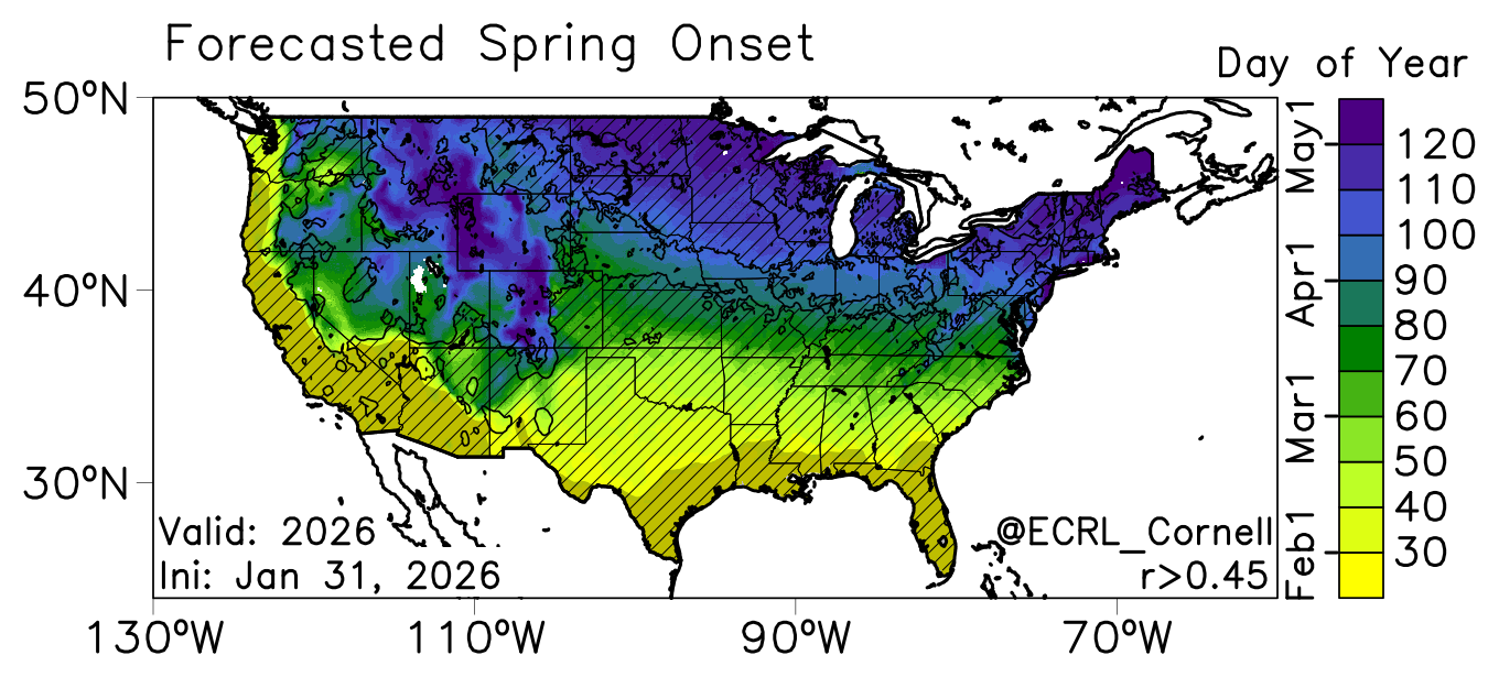 The actual forecasted day of the spring onset (SI-x) is indicated in the table below in calendar days (Day-Of-the-Year units, DOY). This table describes four products related to the SI-x forecast for different initializations (e.g., Jan 15, Jan 31, etc.). Four fields in the table are updated monthly: (1) the Spring Index anomaly (ΔSI-x); (2) the Spring Index (SI-x); (3) a Global Skill defined as CDF of centered anomaly correlation for the entire domain (Wilks, 2011); with two thresholds (0.5 and 0.8) identify skill for different initializations; and (4) a Local Skill defined using Pearson correlation.